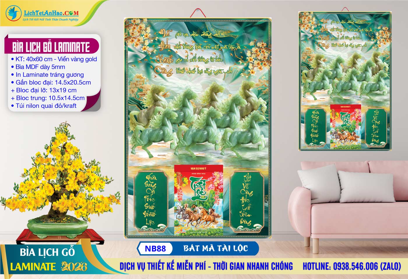2 – Bìa Lịch Gỗ (40×60) Laminate – NB88 – Bát Mã Tài Lộc