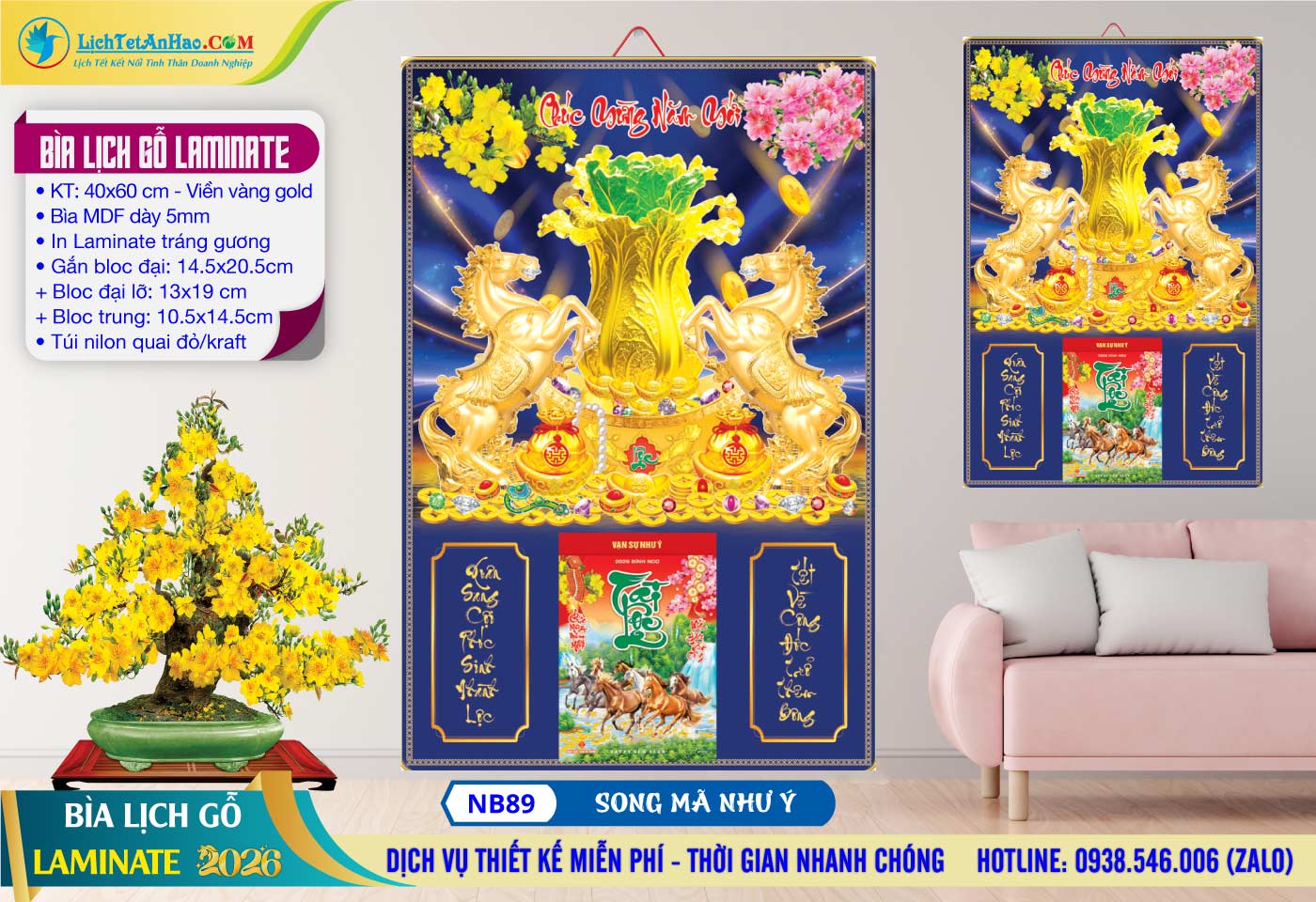3 – Bìa Lịch Gỗ (40×60) Laminate – NB89 – Song Mã Như Ý