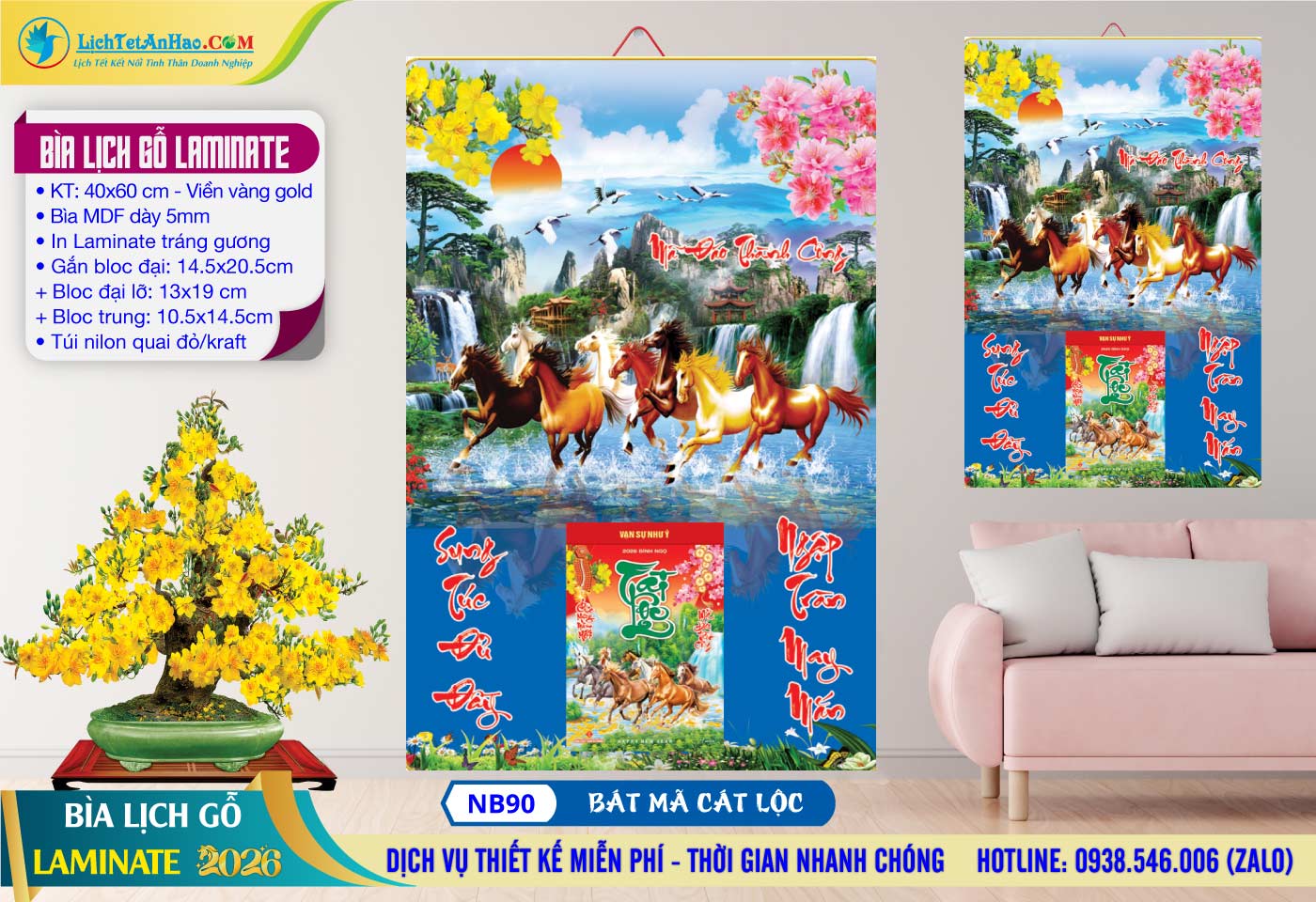 4 – Bìa Lịch Gỗ (40×60) Laminate – NB90 – Bát Mã Cát Lộc