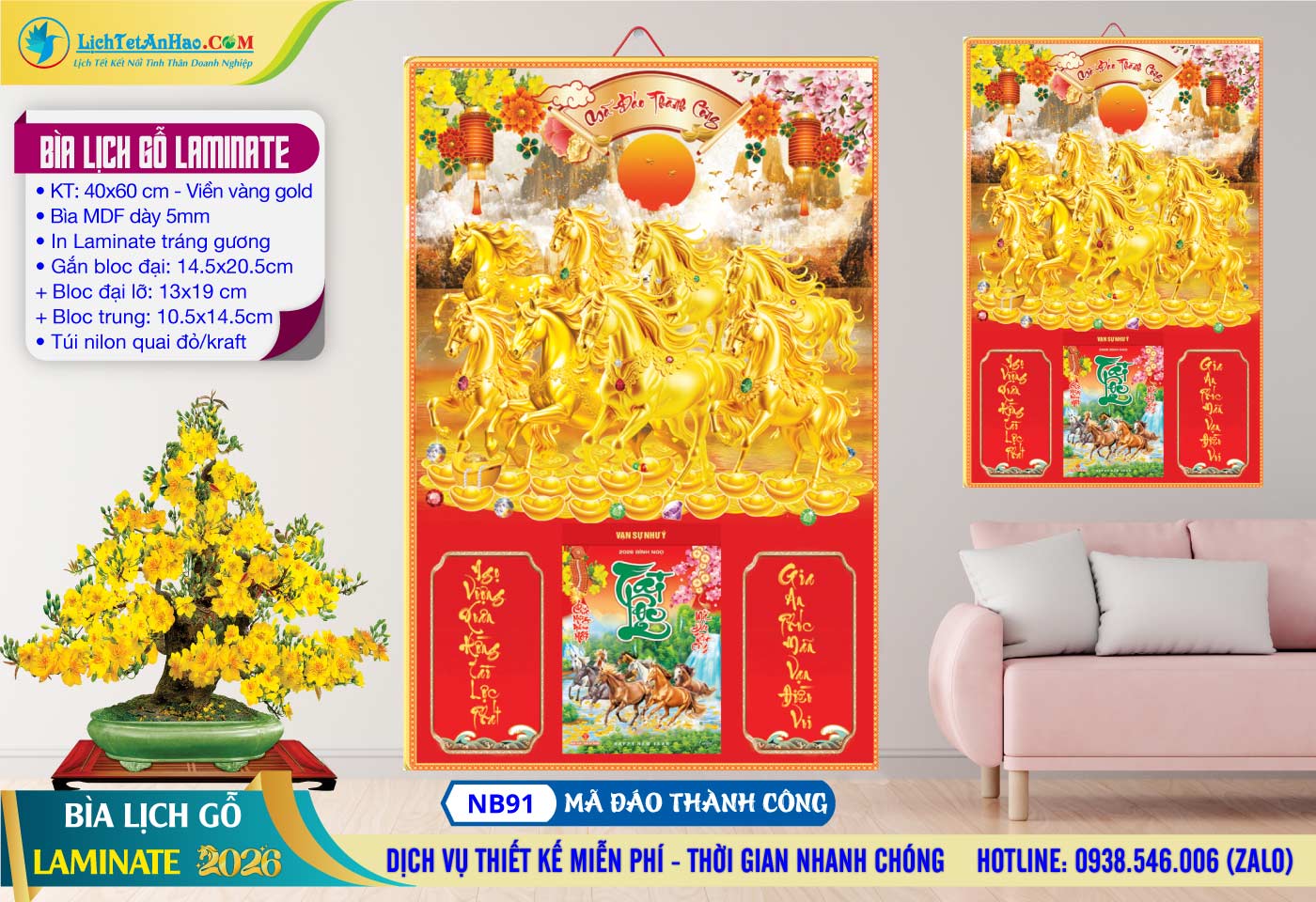 5 – Bìa Lịch Gỗ (40×60) Laminate – NB91 – Mã Đáo Thành Công