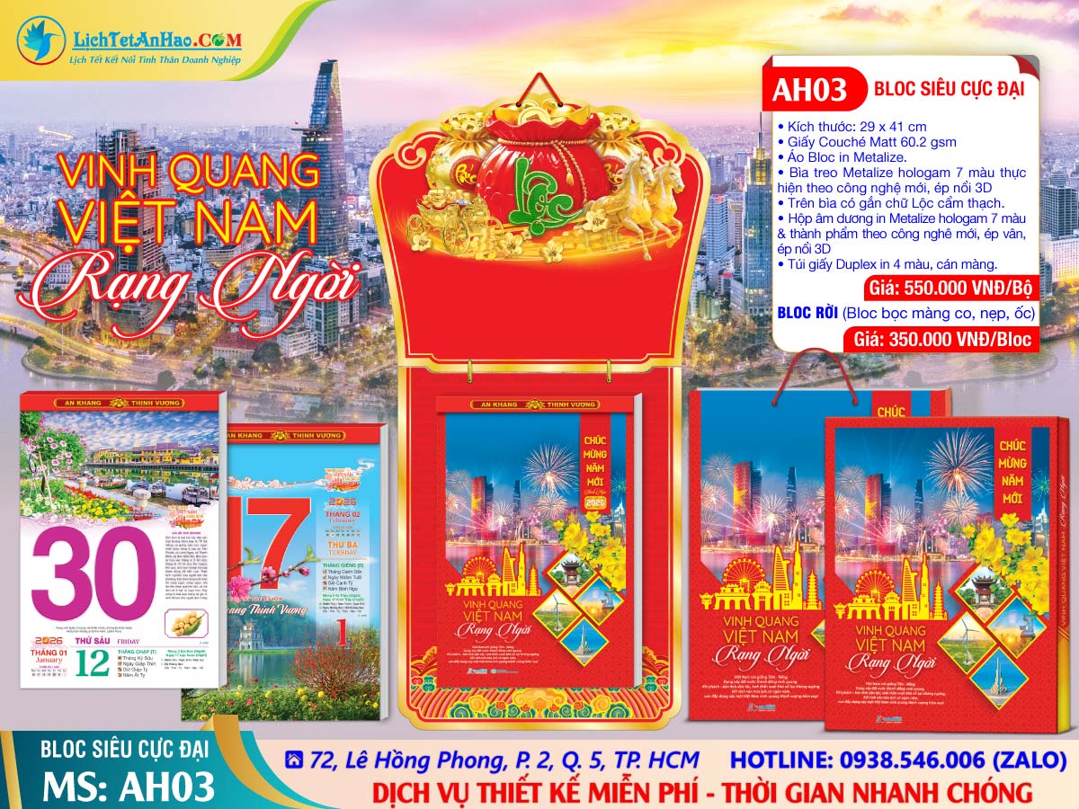 Nối tiếp niềm tự hào về một Việt Nam giàu đẹp và đầy chất thơ, chất chứa những giá trị tinh hoa trong mỗi vùng đất, mỗi con người, nhân năm mới 2026, Cty TNHH An Hảo phát hành bộ lịch bloc với chủ đề VINH QUANG VIỆT NAM RẠNG NGỜI.